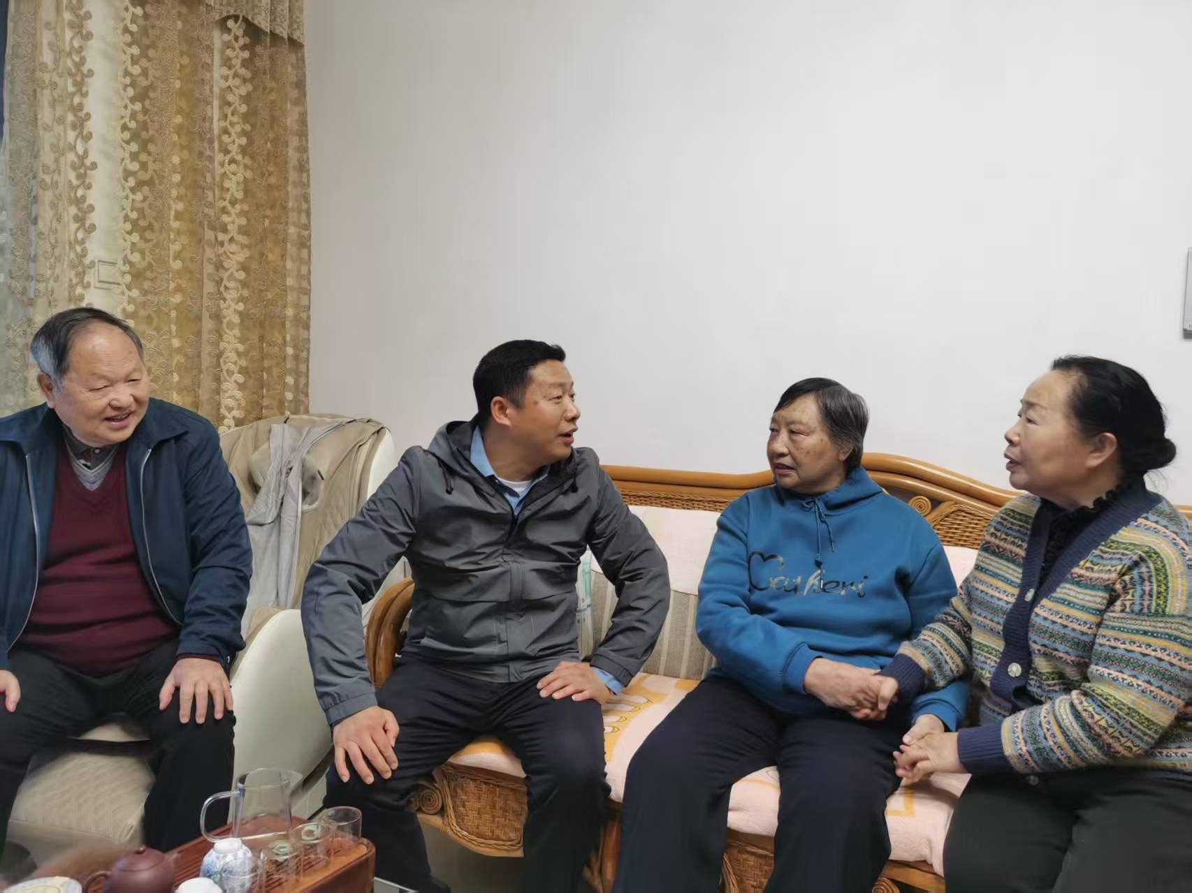 王珲一行与老同志促膝长谈,关切地询问老同志的身体状况、日常起居以及家庭情况,共同回忆起往昔在学校教书育人、伏案工作的难忘岁月。王珲认真倾听老同志的心声与建议,耐心解答了老同志提出的问题,并送上慰问品和诚挚祝福。他表示学校始终牵挂着老同志的生活,离退休工作处将持续聚焦老同志需求,用心、用情、用力做好离退休教职工的服务工作,让老同志们切实感受到学校的温暖与关怀,安享幸福晚年。